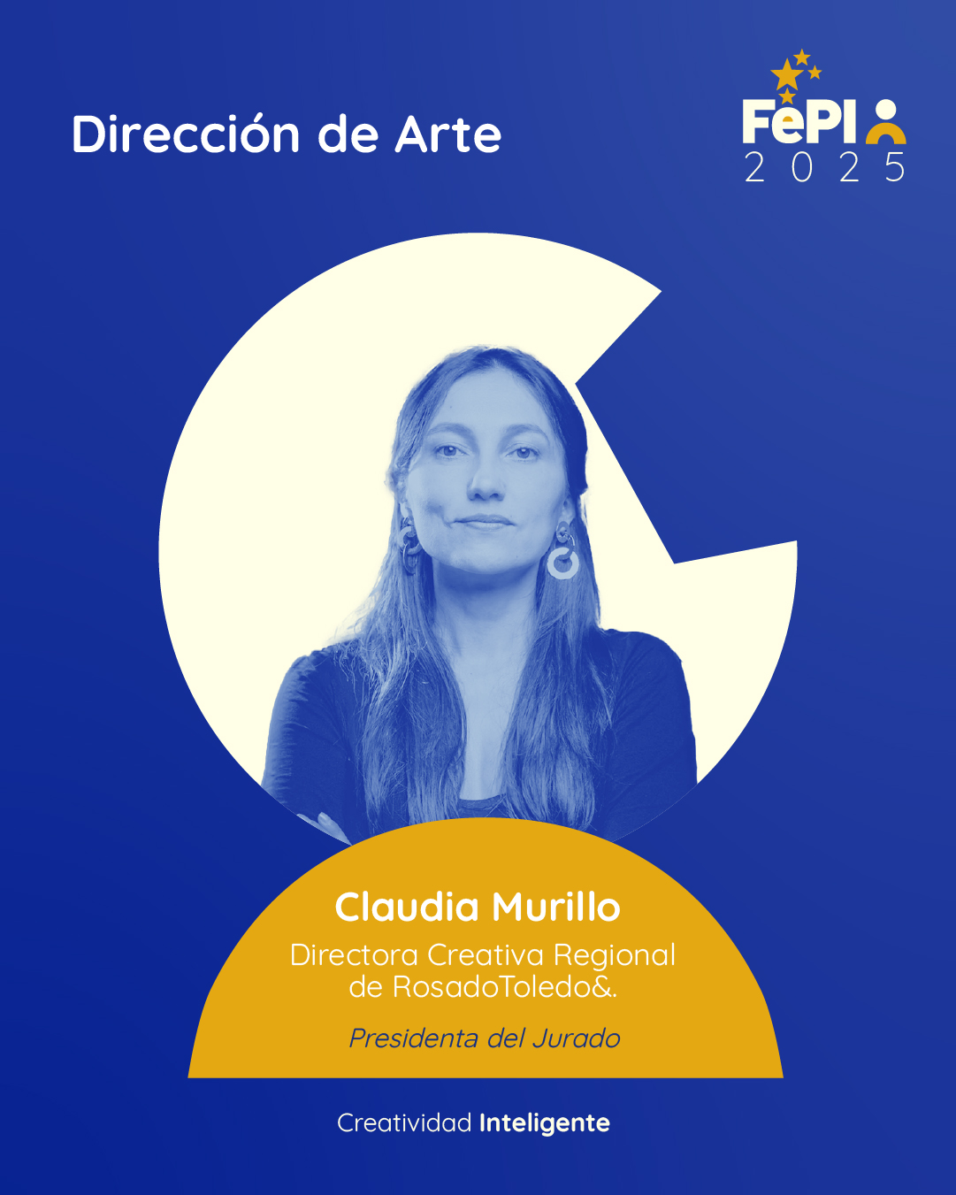 Claudia Murillo, Directora Creativa Regional en RosadoToledo&, presidirá el jurado de la categoría Dirección de Arte en la 19ª edición del FePI 2025. Especialista en diseño para la innovación sostenible y con una Maestría en Ciencias de la Innovación y el Emprendimiento por la Universidad de Warwick, Claudia ha sido galardonada en más de 75 festivales internacionales, incluyendo Cannes Lions y D&AD. Su carrera comenzó en el Museo de Arte Moderno de Bogotá y se consolidó en agencias como Sancho BBDO y JWT. Actualmente, lidera proyectos regionales que integran creatividad, estrategia y compromiso social, con un fuerte enfoque en sostenibilidad y diversidad.
