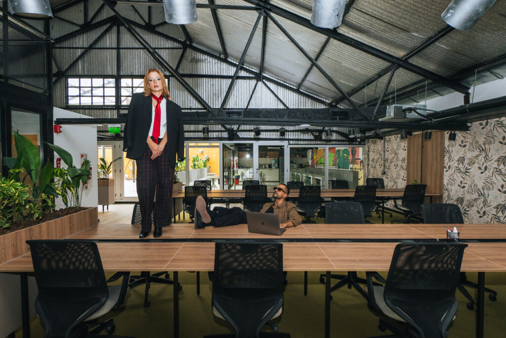 En uno de sus proyectos de diseño, reemplazaron el típico lobby corporativo por una secuencia pensada en “frames”: un muro vegetal de impacto sensorial, un neón con mensaje, un sofá protagonista, y una composición espacial que parece pensada para una story. En otro, diseñaron una terraza vitivinícola urbana con estética de videoclip y espíritu de evento: cada rincón, una postal compartible.